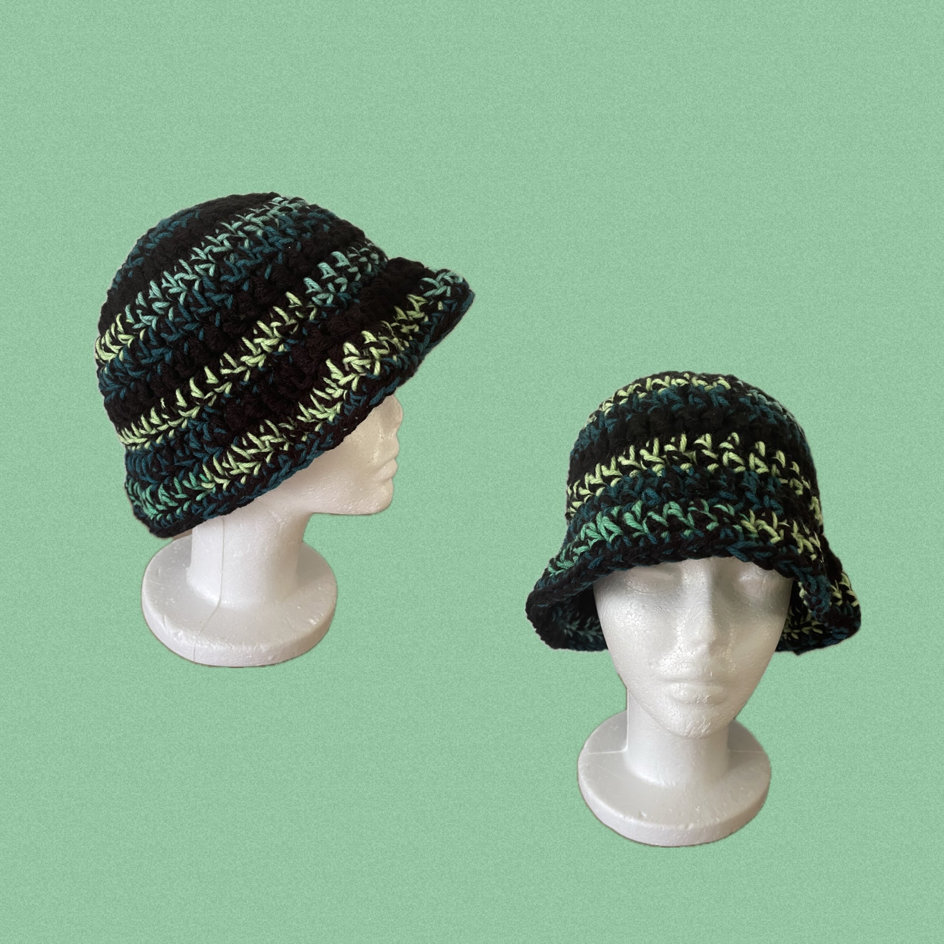 Crochet bucket hat, made with acrylic yarn. Fits average adult size hard. Machine washable in a garment bag or pillow case. Dry on low or lay flat to dry.